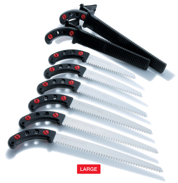 The saws come with a comfortable rubber handle and a custom made, durable black polypropylene holster which can be attached to a belt or leg strap.